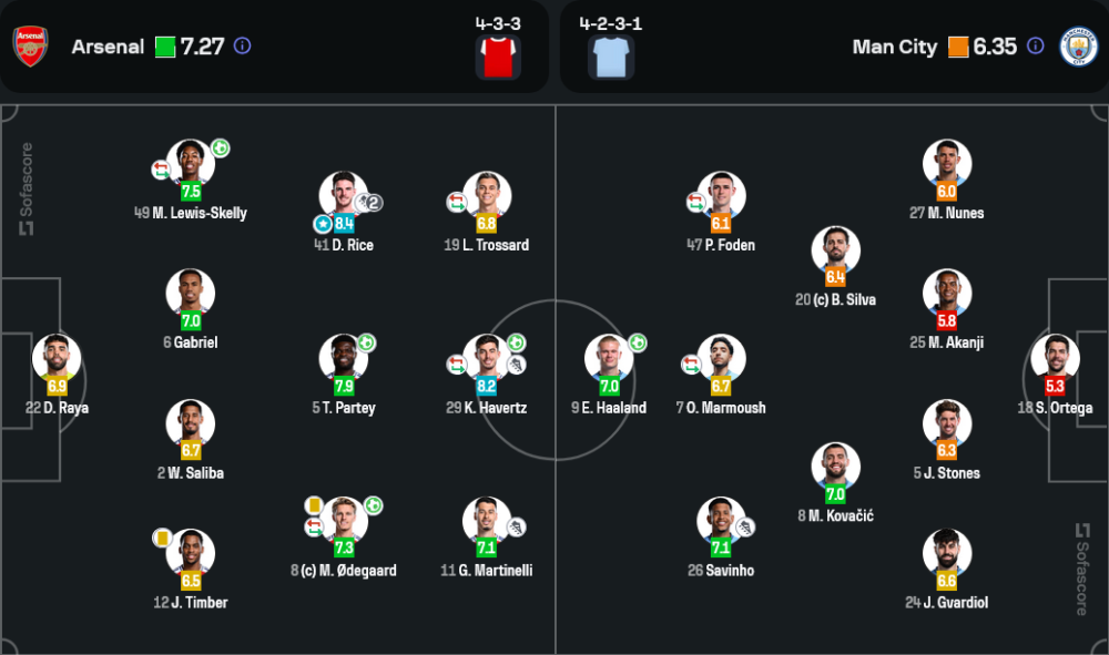 ดีแคลน ไรซ์ คือหัวใจสำคัญของเกมนี้ด้วยคะแนน 8.4 สร้างความแตกต่างในแดนกลางด้วยการจ่ายบอลที่แม่นยำและจังหวะการอ่านเกมที่ยอดเยี่ยม รวมถึงการทำสองแอสซิสต์สำคัญที่ช่วยให้อาร์เซน่อลคว้าชัยได้อย่างงดงาม