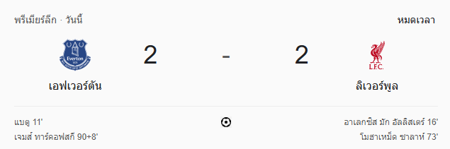 - นาทีที่ 102 กรรมการเป่านกหวีดจบเกม เอฟเวอร์ตันเสมอลิเวอร์พูล 2-2