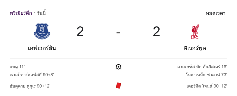 บ้านผลบอล สรุปหลังเกม ทอฟฟี่ไม่ยอม! เอฟเวอร์ตันไล่เจ๊าลิเวอร์พูล 2-2 ช่วงทดเจ็บ หงส์แดงพลาดสามแต้ม