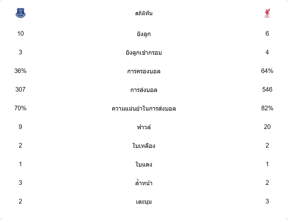 เกมนี้ ลิเวอร์พูล ครองบอลได้มากถึง 64% ขณะที่ เอฟเวอร์ตัน มีเพียง 36% แต่แม้จะครองบอลน้อยกว่า เจ้าบ้านกลับมีโอกาสยิงมากกว่าถึง 10 ครั้ง (เข้ากรอบ 3) เทียบกับลิเวอร์พูลที่มีเพียง 6 ครั้ง (เข้ากรอบ 4) แสดงให้เห็นถึงความอันตรายของเกมสวนกลับของทอฟฟี่สีน้ำเงิน