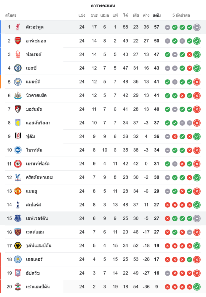 ลิเวอร์พูลยังนำเป็นจ่าฝูงมี 57 คะแนน ส่วนเอฟเวอร์ตันอยู่ที่ อันดับ 15 มี 27 คะแนน ยังต้องสู้ต่อเพื่อลุ้นหนีโซนตกชั้น