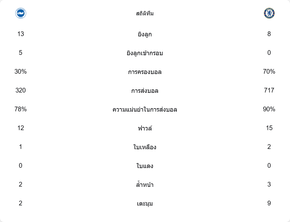 สถิติเหล่านี้สะท้อนให้เห็นว่า แม้เชลซีจะเหนือกว่าทางด้านการครองบอลและการผ่านบอล แต่ความแตกต่างสำคัญอยู่ที่ประสิทธิภาพในการเข้าทำและการใช้โอกาส ซึ่งไบรท์ตันทำได้ดีกว่าอย่างชัดเจน ส่งผลให้พวกเขาเป็นฝ่ายคว้าชัยไปแบบขาดลอย 3-0