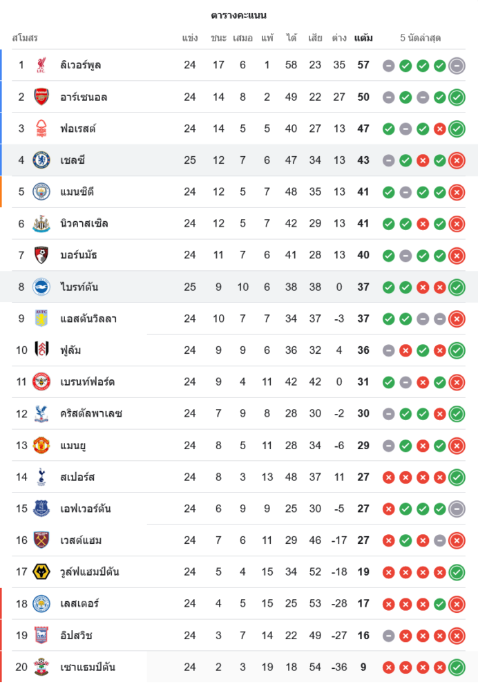 ชัยชนะเกมนี้ส่งให้ ไบรท์ตัน ขยับขึ้นมาอยู่ที่ 8 มี 37 แต้ม ตามหลังพื้นที่ท็อป 6 เพียง 3 แต้ม ขณะที่ เชลซี ยังคงรั้งอันดับ 4 มี 43 แต้ม โดยมี แมนฯ ซิตี้ และ นิวคาสเซิ่ล ตามจี้มาติดๆ ที่ 41 แต้ม