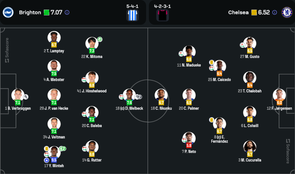 ไบรท์ตัน วางหมากในระบบ 5-4-1 เน้นเกมรับแน่นและรอสวนกลับเร็ว โดยใช้ มิโตมะ และ มินเทห์ เป็นตัวป่วนเกมรับเชลซี ขณะที่แดนกลางมี เวลเบ็ค ช่วยพักบอลและจ่ายคิลเลอร์พาส เกมรับของพวกเขาทำได้อย่างยอดเยี่ยม โดยเฉพาะ อดัม เว็บสเตอร์ และ แยน พอล ฟาน เฮคเก้ ที่คุมพื้นที่ได้ดี