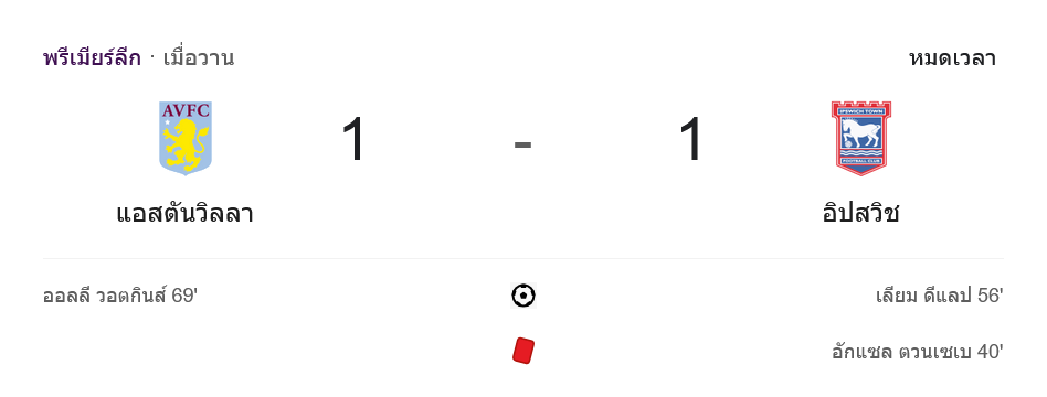 ผลบอลสด พรีเมียร์ลีก 2024 นัดที่ แอสตัน วิลล่า เปิดรัง วิลล่า พาร์ค ต้อนรับการมาเยือนของ อิปสวิช ทาวน์ เกมนี้เจ้าถิ่นพยายามครองเกมและบุกเข้าใส่คู่แข่งอย่างต่อเนื่อง แต่กลับโดนนำก่อนจากประตูของ เลียม ดีแลป ก่อนที่ โอลลี่ วัตกินส์ จะมาตีเสมอให้ วิลล่า แบ่งแต้มกันไปในท้ายที่สุด เกมนี้ อเล็กซ์ พาล์มเมอร์ นายทวารของ อิปสวิช เซฟช่วยทีมไว้ได้หลายจังหวะจนได้รับรางวัล Man of the Match ไปครอง