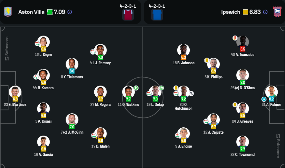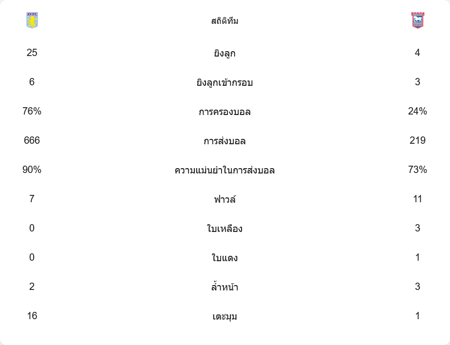 แอสตัน วิลล่า ครองเกมได้ดีกว่าอย่างเห็นได้ชัดด้วยอัตราการครองบอล 76% และสร้างโอกาสยิงได้ถึง 25 ครั้ง อย่างไรก็ตาม พวกเขายังขาดความเด็ดขาดในการจบสกอร์ แม้จะใช้ระบบ 4-2-3-1 ที่มีเกมรุกหลากหลาย แต่การเจาะแนวรับที่เหนียวแน่นของ อิปสวิช ยังทำได้ไม่ดีพอ