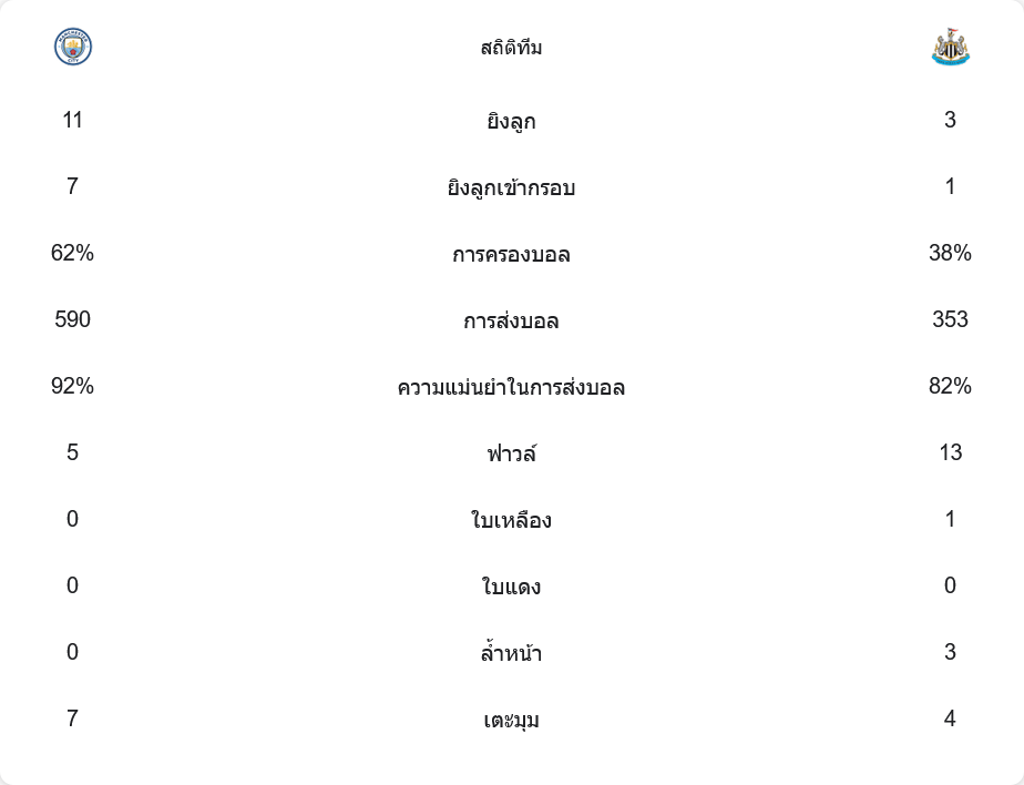 นิวคาสเซิ่ล พยายามตั้งรับแน่นและอาศัยการโต้กลับเร็ว แต่ด้วยการครองบอลที่ต่ำเพียง 38% และมีโอกาสยิงเพียง 3 ครั้ง ทำให้พวกเขาแทบไม่ได้สร้างความอันตรายให้กับแนวรับของ แมนฯ ซิตี้