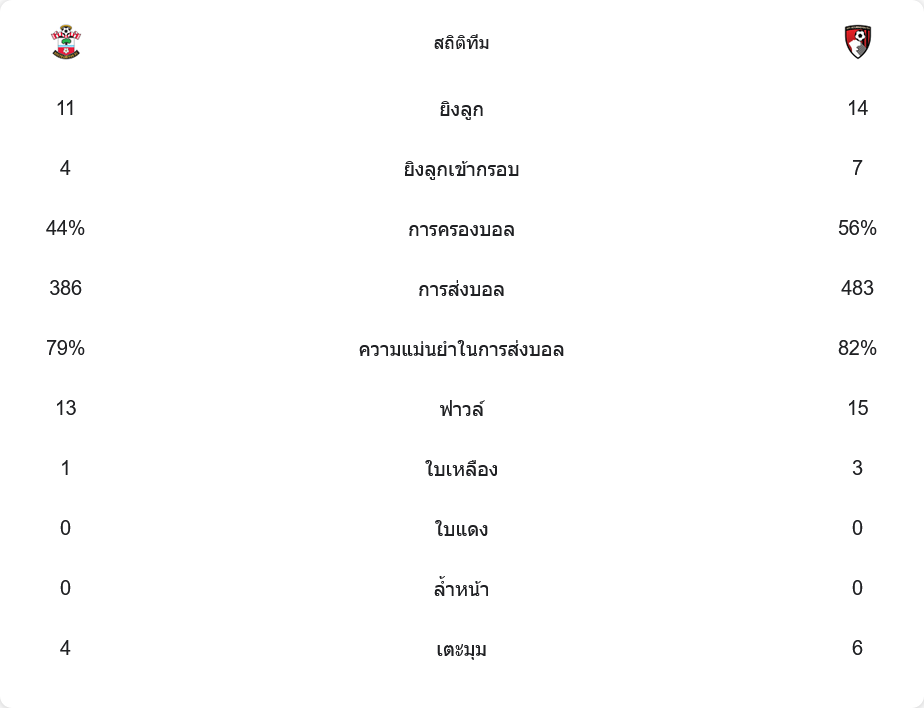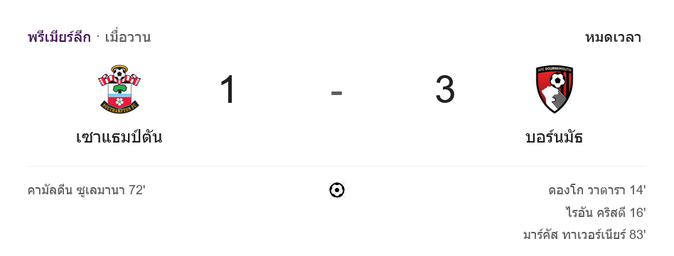 แต่ความหวังของเซาแธมป์ตันต้องดับลงในนาทีที่ 83 เมื่อ มาร์คัส ทาเวอร์เนียร์ ยิงประตูย้ำชัยให้บอร์นมัธนำ 3-1 ปิดฉากเกมอย่างสมบูรณ์แบบ ส่งผลให้ทีมเยือนเก็บสามแต้มสำคัญออกไปได้