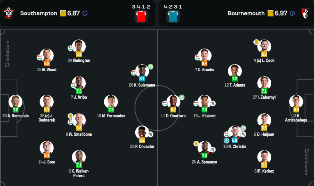 บอร์นมัธมาในระบบ 4-2-3-1 ที่มีความสมดุลสูง เล่นได้ทั้งรุกและรับ เกมรุกอาศัยความเร็วของวาตาราและคริสตี้ทำให้แนวรับเซาแธมป์ตันเจอปัญหาตลอด ส่วนแผงมิดฟิลด์ของเซาแธมป์ตันที่มาในระบบ 3-4-1-2 ยังขาดความแน่นอน และเจาะแนวรับของบอร์นมัธได้ยาก ทำให้เกมนี้ทีมเยือนสามารถควบคุมเกมได้ดีกว่า