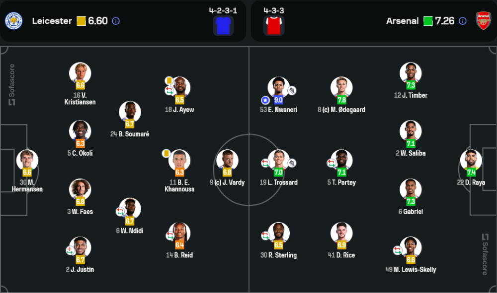 อาร์เซนอล เล่นด้วยระบบ 4-3-3 ที่มีความยืดหยุ่นสูง โดยอาศัย มาร์ติน โอเดการ์ด เป็นจอมทัพคอยปั้นเกมจากกลางสนาม ในขณะที่ เอ็นวาเนรี และ ทรอสซาร์ด ช่วยกันลากบอลขึ้นหน้า เมริโน่ ที่ถูกส่งลงมาในครึ่งหลัง กลายเป็นตัวทีเด็ดที่สามารถพังประตูได้สองลูก ส่วนแนวรับ ซาลิบา และ กาเบรียล คุมเกมรับได้แน่นหนา