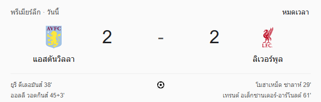 - นาทีที่ 96 กรรมการเป่านกหวีดจบเกม แอสตัน วิลล่าเสมอลิเวอร์พูล 2-2!