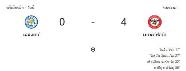 - นาทีที่ 50 กรรมการเป่าหมดครึ่งแรก เบรนท์ฟอร์ดนำ เลสเตอร์ 3-0