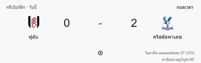 คริสตัล พาเลซ โชว์เกมรับแน่นและเกมสวนกลับสุดเฉียบ บุกเอาชนะ ฟูแล่ม คาถิ่น 2-0 จากการทำเข้าประตูตัวเองของ โยอาคิม แอนเดอร์เซ่น และลูกยิงสุดคมของ ดานิเอล มูญอซ ทำให้พาเลซคว้าสามแต้มล้ำค่าได้สำเร็จ!