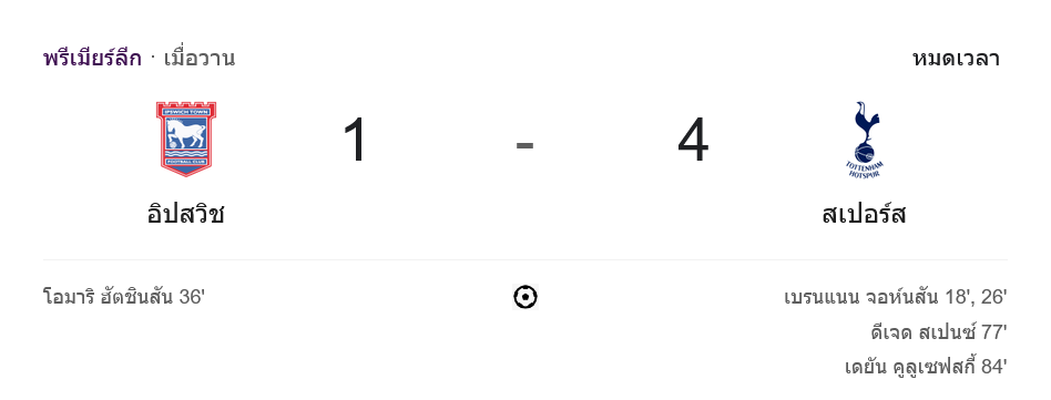 จาก : ผลบอลสด พรีเมียร์ลีก 2024 ระหว่าง อิปสวิช ทาวน์ 1-4 ท็อตแน่ม ฮ็อทสเปอร์ วันนี้ 22/2/68 – บ้านกีฬา