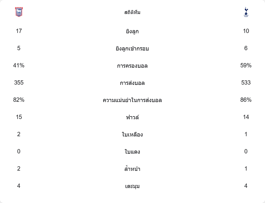 แม้ว่าท็อตแน่มจะครองบอลมากกว่า 59% และจ่ายบอลได้แม่นยำกว่า 86% เมื่อเทียบกับ 82% ของอิปสวิช แต่เจ้าบ้านกลับมีโอกาสยิงมากกว่าที่ 17 ครั้ง ส่วนสเปอร์สมี 10 ครั้ง แต่ที่แตกต่างกันคือความคมในการจบสกอร์ ทีมเยือนยิงเข้ากรอบ 6 ครั้ง และได้ 4 ประตู ขณะที่อิปสวิชยิงเข้ากรอบเพียง 5 ครั้ง