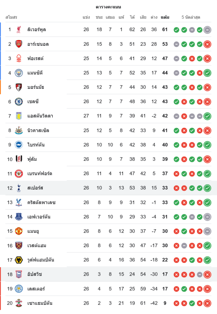สเปอร์ส ขยับขึ้นมา อันดับ 12 มี 33 คะแนน ไล่กดดันพื้นที่ยุโรป ส่วน อิปสวิช ยังคงอยู่ในโซนตกชั้นที่ อันดับ 18 มี 17 คะแนน ต้องดิ้นรนหนีตกชั้นอย่างหนัก
