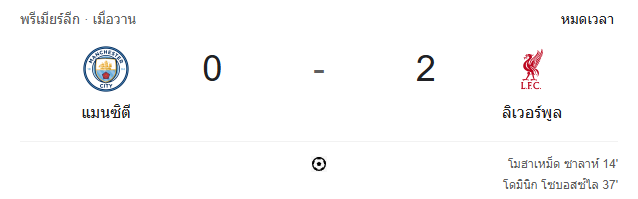 - นาทีที่ 48 กรรมการเป่าหมดครึ่งแรก ลิเวอร์พูลนำ แมนฯ ซิตี้ 2-0