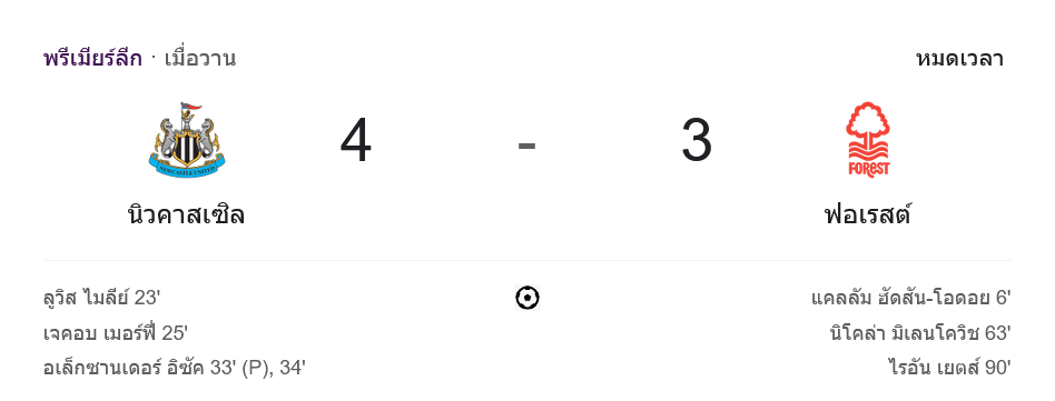 ศึก พรีเมียร์ลีก 2024 นัดเดือดที่สนาม เซนต์ เจมส์ พาร์ค เมื่อคืนนี้จบลงด้วยชัยชนะของ นิวคาสเซิ่ล ยูไนเต็ด ที่เฉือนเอาชนะ น็อตติ้งแฮม ฟอเรสต์ ไปแบบสุดมันส์ 4-3 โดยมี อเล็กซานเดอร์ อิซัค เป็นตัวแปรสำคัญของเกม พาทีมคว้าสามแต้มล้ำค่า ขยับขึ้นสู่อันดับ 5 ของตาราง บ้านผลบอล เกมนี้ทั้งสองทีมเปิดหน้าแลกหมัดกันอย่างดุเดือด มีประตูเกิดขึ้นต่อเนื่องตั้งแต่ต้นจนจบ ถือเป็นแมตช์สุดเร้าใจของซีซั่น