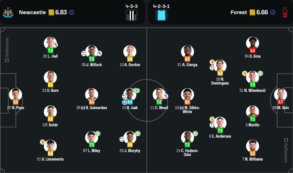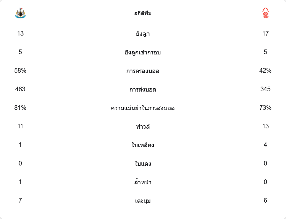 แม้ ฟอเรสต์ จะมีโอกาสยิงมากกว่า (17 ครั้ง) เทียบกับ นิวคาสเซิ่ล (13 ครั้ง) แต่การครองบอลของเจ้าถิ่นอยู่ที่ 58% แสดงให้เห็นถึงการเล่นที่เหนือกว่าในจังหวะสำคัญ การผ่านบอลของ นิวคาสเซิ่ล อยู่ที่ 463 ครั้ง ขณะที่ ฟอเรสต์ มีเพียง 345 ครั้ง แสดงให้เห็นว่าทีมเยือนต้องดิ้นรนหนักในการต่อบอล