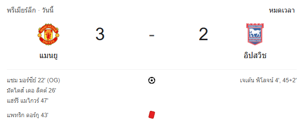 - นาทีที่ 50 กรรมการเป่าหมดครึ่งแรก แมนฯ ยูไนเต็ด เสมอ อิปสวิช 2-2
