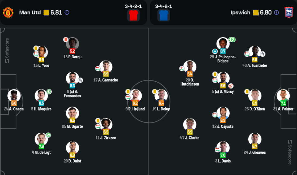 อย่างไรก็ตาม ช่วงทดเวลาบาดเจ็บของครึ่งแรก อิปสวิชมาตามตีเสมอจาก เจเดน ฟิโลจีน-บิแดซ คนเดิม จบครึ่งแรกที่สกอร์ 2-2 แต่ก่อนหมดเวลา แพทริค ดอร์กู ของแมนฯ ยูไนเต็ดโดนใบแดง ทำให้เจ้าบ้านต้องเล่น 10 คนในครึ่งหลัง!
