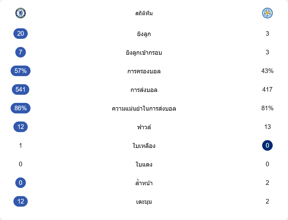 เกมนี้เชลซีเน้นเกมรุกจากการครองบอลอย่างมีประสิทธิภาพ (57%) และการส่งบอลที่แม่นยำถึง 86% โดยใช้การจ่ายบอลสั้นและเคลื่อนที่เร็วเพื่อเปิดพื้นที่ในแนวรับของเลสเตอร์ ขณะที่เลสเตอร์ ซิตี้พยายามตั้งรับแน่นและสวนกลับเร็ว แต่ขาดความเฉียบคมในการเข้าทำประตู ทำให้การวิเคราะห์บอลในเกมนี้ ชัดเจนว่าเชลซีสามารถควบคุมจังหวะเกมได้ดีกว่า ทั้งการบุกและการรับ