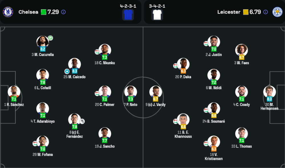 มอยเซส ไกเซโด้ ของเชลซี ได้รับคะแนนสูงสุด 8.3 ด้วยการคุมเกมแดนกลางได้ยอดเยี่ยม ทั้งการสกัดบอล การจ่ายบอลที่แม่นยำ และการสร้างโอกาสให้เพื่อนร่วมทีมได้อย่างต่อเนื่อง