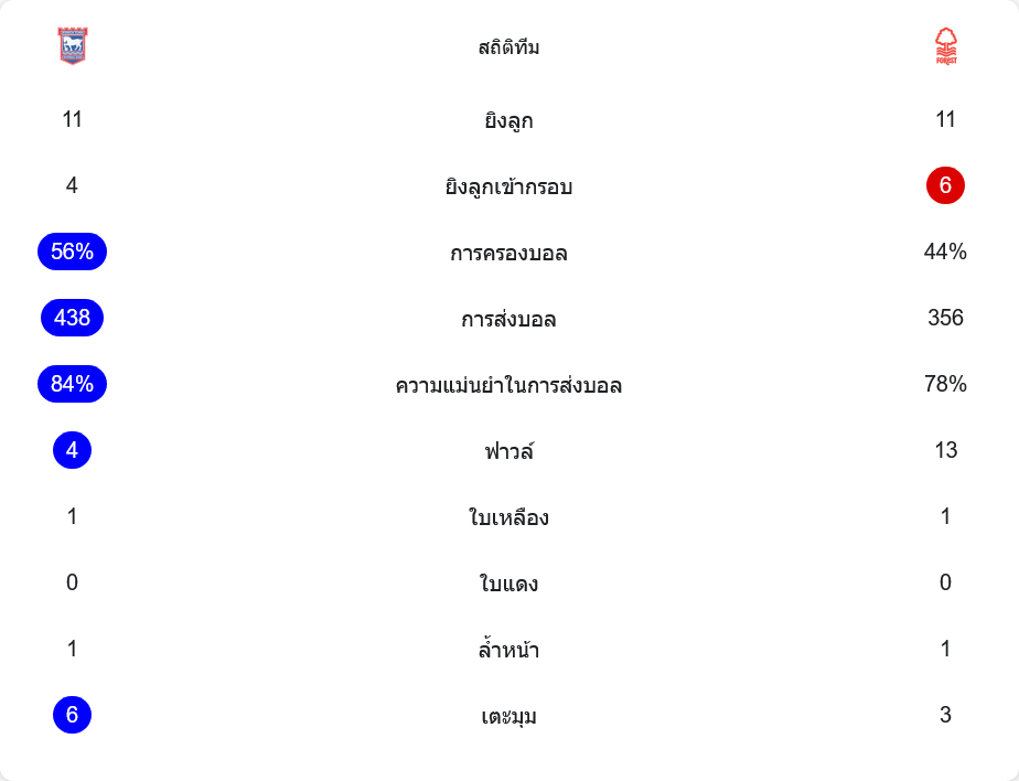 แม้อิปสวิชจะครองบอลมากกว่า (56%) แต่ฟอเรสต์มีโอกาสยิงเข้ากรอบถึง 6 ครั้ง เทียบกับ 4 ครั้ง ของเจ้าบ้าน เกมรับของฟอเรสต์ยังเหนียวแน่น ตัดเกมด้วยการทำฟาวล์ถึง 13 ครั้ง และแนวรับนำโดย มิเลนโควิช ก็โชว์ฟอร์มได้อย่างแข็งแกร่ง