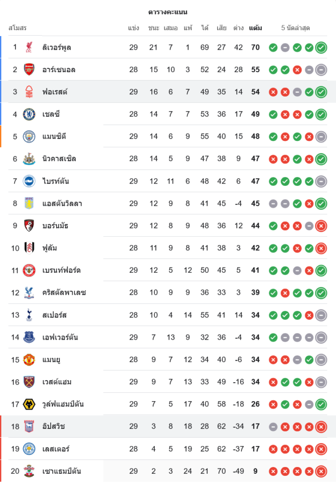 ชัยชนะของ ฟอเรสต์ ทำให้พวกเขาขยับขึ้นมาอยู่ อันดับ 3 ใน ตารางพรีเมียร์ลีก มี 54 คะแนน ลุ้นท็อปโฟร์เต็มตัว ด้าน อิปสวิช ยังคงจมอยู่ในโซนตกชั้นที่ อันดับ 18 มีเพียง 17 คะแนน