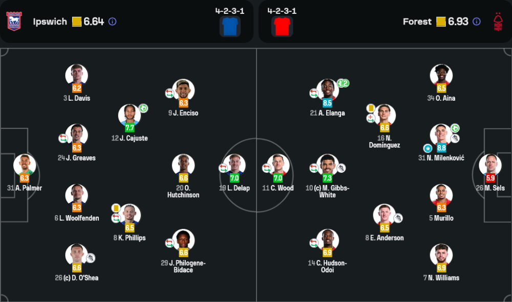 เกมนี้ ฟอเรสต์ ใช้ระบบ 4-2-3-1 ที่เน้นความเร็วของเกมรุก โดยเฉพาะ อีลังก้า ที่เป็นอาวุธสำคัญตัดแนวรับอิปสวิช เกมบุกของพวกเขามีความดุดัน สร้างโอกาสได้ถึง 6 ครั้งตรงกรอบ ซึ่งถือว่าเหนือกว่าเจ้าบ้านอย่างชัดเจน