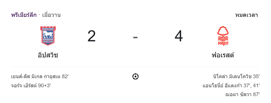 แม้ว่าในช่วงทดเจ็บ อิปสวิช จะมาได้ประตูปลอบใจจาก จอร์จ เฮิร์สต์ ในนาทีที่ 90+3 แต่ก็ไม่ทัน จบเกม น็อตติ้งแฮม ฟอเรสต์ บุกถล่ม 4-2
