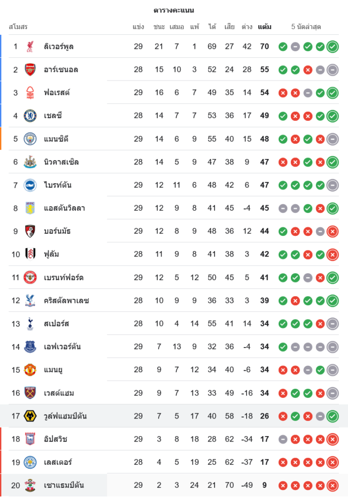 วูล์ฟแฮมป์ตัน ขยับขึ้นมาอยู่อันดับ 17 ของตาราง มี 26 แต้ม จาก 29 นัด ยังคงต้องดิ้นรนหนีตกชั้น ส่วน เซาแธมป์ตัน ยังคงรั้งอันดับ 20 เป็นบ๊วยของตาราง มีเพียง 9 แต้มเท่านั้น