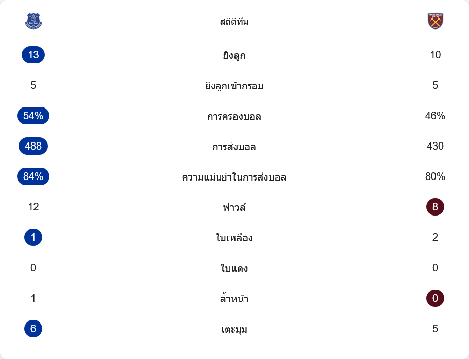แม้ว่า เอฟเวอร์ตัน จะครองบอลได้มากกว่า (54%) แต่ทั้งสองทีมมีโอกาสยิงเข้ากรอบเท่ากัน (5 ครั้ง) เวสต์แฮมทำฟาวล์น้อยกว่า (8 ต่อ 12) และรับใบเหลืองมากกว่า (2 ใบต่อ 1 ใบ) การผ่านบอลของทั้งสองทีมถือว่ามีประสิทธิภาพใกล้เคียงกัน โดย เอฟเวอร์ตัน ผ่านบอลแม่นยำ 84% และ เวสต์แฮม ที่ 80%