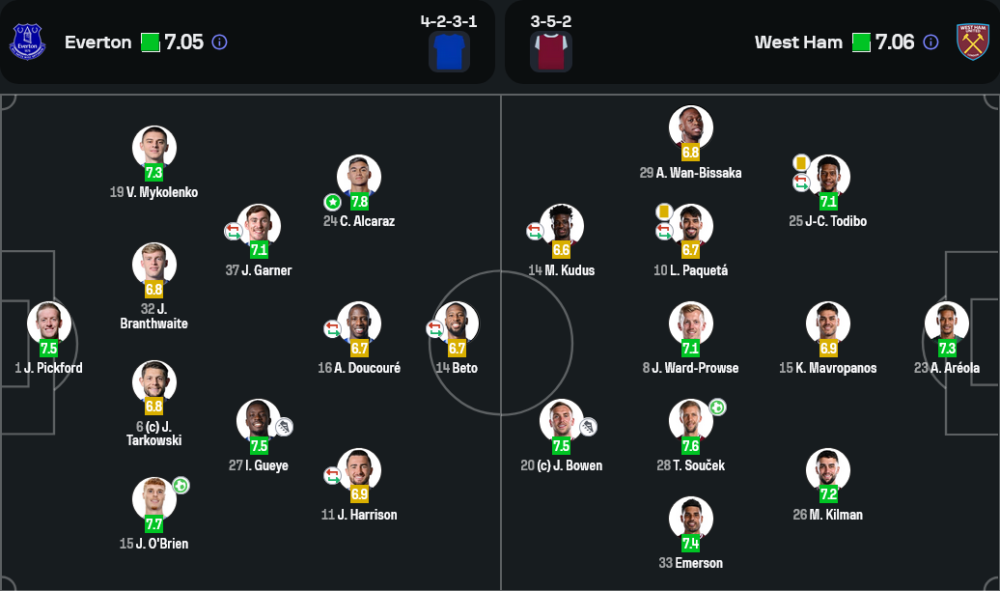 เกมนี้ เอฟเวอร์ตัน ใช้แผน 4-2-3-1 ที่เน้นความสมดุลในแดนกลางเพื่อครองบอล (54%) และสร้างโอกาสเข้าทำ โดย อัลการาซ โดดเด่นในบทบาทตัวรุก คอยสนับสนุน เบโต้ ในแดนหน้า ขณะที่เกมรับมี โอไบรอัน ที่แข็งแกร่งตัดบอลได้หลายครั้ง