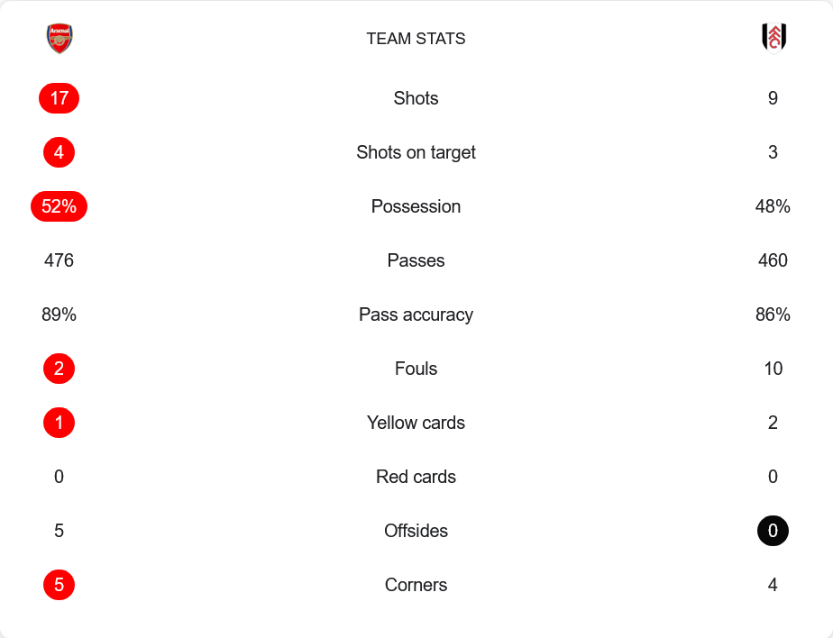 ในเกมนี้ อาร์เซนอล มีโอกาสยิงมากกว่าอย่างเห็นได้ชัด โดยยิงทั้งหมด 17 ครั้ง และตรงกรอบ 4 ครั้ง ขณะที่ ฟูแล่ม ยิงเพียง 9 ครั้ง และตรงกรอบ 3 ครั้ง การครองบอลของ อาร์เซนอล อยู่ที่ 52% โดยมีการจ่ายบอลสำเร็จทั้งหมด 476 ครั้ง ด้วยความแม่นยำ 89% ส่วน ฟูแล่ม ครองบอลได้ 48% และจ่ายบอลสำเร็จ 460 ครั้ง ความแม่นยำ 86%