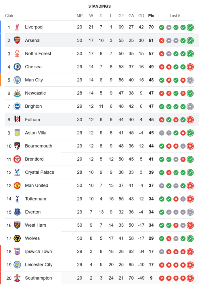 ชัยชนะในเกมนี้ส่งผลให้ อาร์เซนอล มีคะแนนรวม 61 คะแนน จาก 30 นัด อยู่อันดับที่ 2 ตามหลัง ลิเวอร์พูล ที่นำเป็นจ่าฝูง 70 คะแนน ขณะที่ ฟูแล่ม ยังคงมี 45 คะแนน อยู่อันดับที่ 8 และต้องเร่งฟอร์มเพื่อไล่ตามพื้นที่ยุโรป