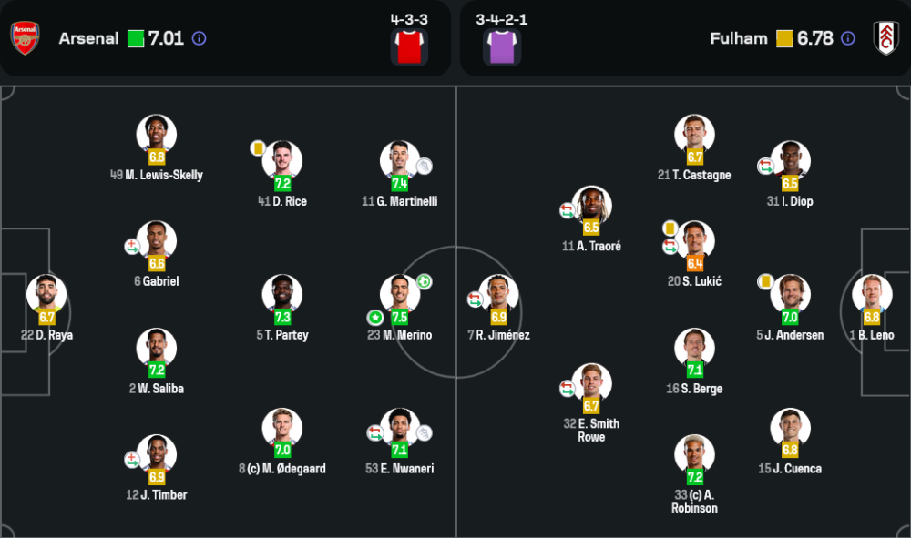 มิเกล เมริโน่ กองกลางของ อาร์เซนอล ที่ทำผลงานได้อย่างยอดเยี่ยม ยิงประตูสำคัญให้ทีมขึ้นนำ และสร้างโอกาสให้กับเพื่อนร่วมทีมได้อย่างต่อเนื่อง คะแนนความสามารถ 7.5