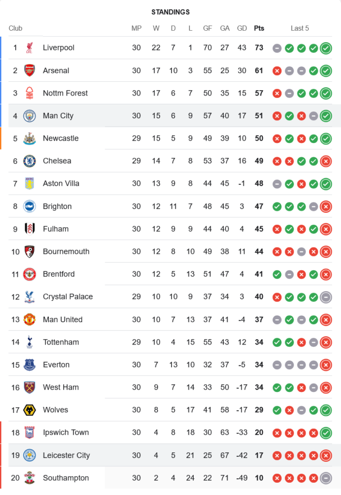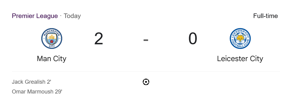 ชัยชนะครั้งนี้ทำให้ แมนเชสเตอร์ ซิตี้ ขยับขึ้นมาอยู่ที่อันดับ 4 ของตารางพรีเมียร์ลีก 2025 ด้วยคะแนน 51 แต้ม จาก 30 นัด ในขณะที่ เลสเตอร์ ซิตี้ ยังคงอยู่ในโซนตกชั้น อันดับที่ 19 มีเพียง 17 แต้ม จาก 30 นัด นับว่าเป็นสถานการณ์ที่น่าเป็นห่วงอย่างยิ่งสำหรับพวกเขา