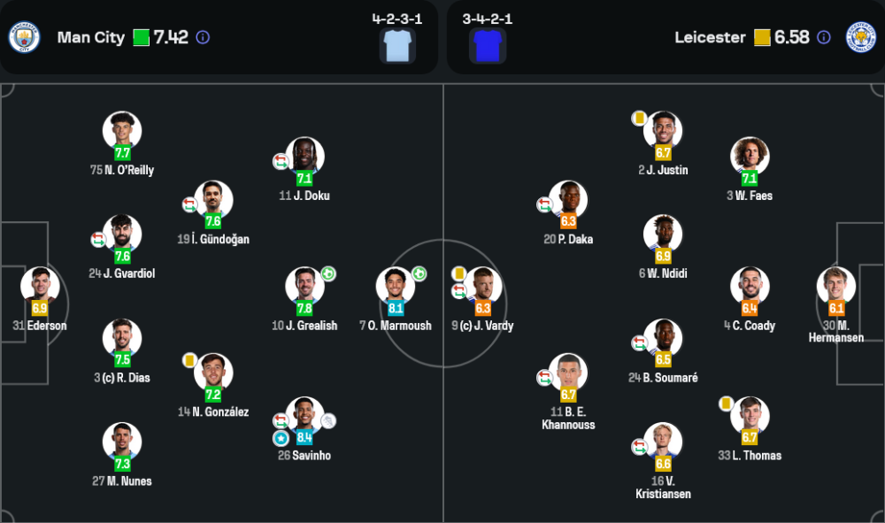 • ตัวรุก: ซาวินโญ่ (8.4), แจ็ค กรีลิช (7.8), เจเรมี่ โดกู (7.1)