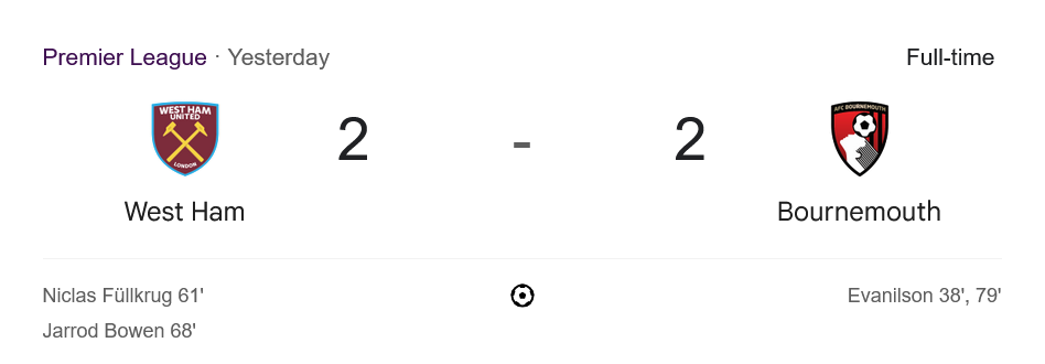 จาก : ผลบอลสด พรีเมียร์ลีก 2025 ระหว่าง เวสต์แฮมยูไนเต็ด 2-2 บอร์นมัธ เอเอฟซี วันนี้ 5/4/68 – บ้านกีฬา
