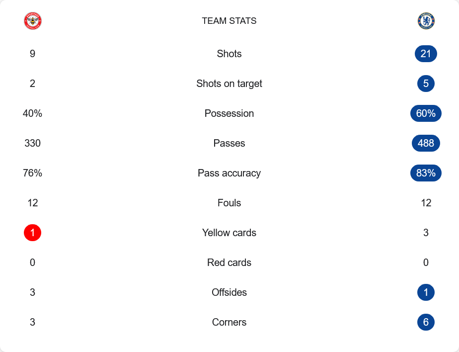 แม้ เชลซี จะมีโอกาสยิงถึง 21 ครั้ง โดยเข้ากรอบ 5 ครั้ง แต่กลับไม่สามารถเปลี่ยนเป็นประตูได้ ขณะที่ เบรนท์ฟอร์ด ยิงเพียง 9 ครั้ง และเข้ากรอบแค่ 2 ครั้ง แต่เกมรับของพวกเขาแข็งแกร่งจนคู่แข่งเจาะไม่เข้า เชลซีครองบอลได้ถึง 60% และผ่านบอลทั้งหมด 488 ครั้ง ในขณะที่ เบรนท์ฟอร์ด ทำได้เพียง 330 ครั้งเท่านั้น
