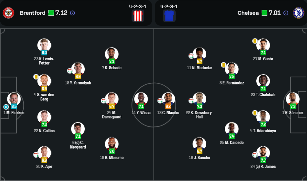 กองกลางตัวรุก: นอเนีย มาดูเอเก้ (6.7), คาร์นิว ดิวส์บิวรี-ฮอลล์ (7.3), เจดอน ซานโช (6.7)