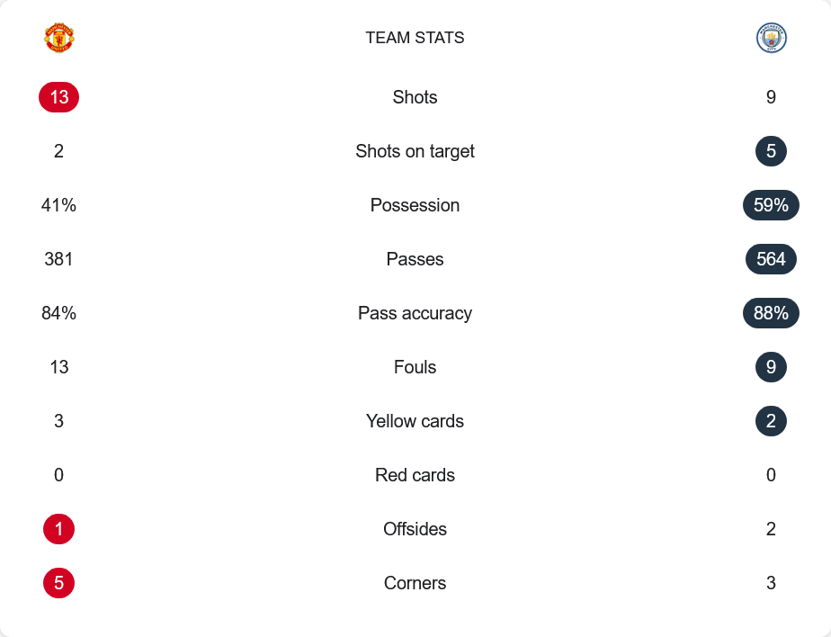 แมนเชสเตอร์ ซิตี้ ครองบอลได้มากกว่าด้วยสัดส่วน 59% และผ่านบอลสำเร็จ 564 ครั้ง ด้วยความแม่นยำถึง 88% ขณะที่ แมนเชสเตอร์ ยูไนเต็ด มีโอกาสยิงทั้งหมด 13 ครั้ง โดยเข้ากรอบเพียง 2 ครั้งเท่านั้น แม้จะสร้างสรรค์โอกาสได้หลายครั้งแต่การจบสกอร์ยังคงเป็นปัญหา