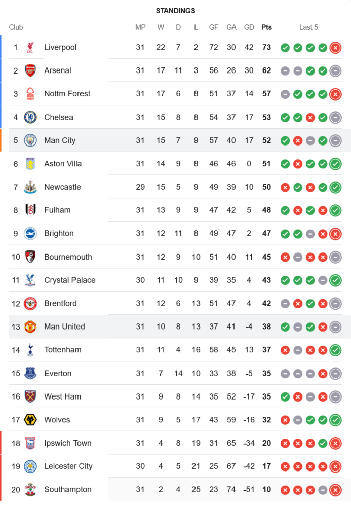 ในขณะที่ แมนเชสเตอร์ ซิตี้ มีโปรแกรมการแข่งขันกับ คริสตัล พาเลซ ที่สนามเอติฮัด สเตเดียม ในวันที่ 12 เมษายน 2025 เวลา 18:30 น. ต่อด้วยการไปเยือน เอฟเวอร์ตัน วันที่ 19 เมษายน 2025 เวลา 21:00 น. โปรแกรมเหล่านี้มีความสำคัญอย่างมากในการเก็บแต้มเพื่อยืนในตำแหน่งที่ดีใน ตารางบอล