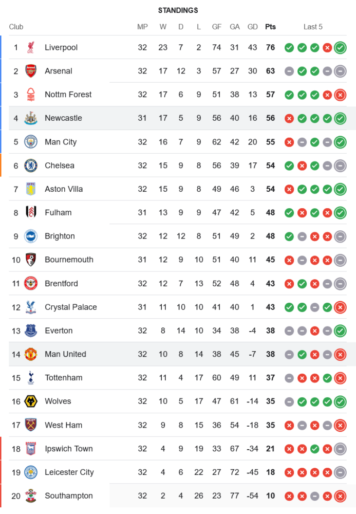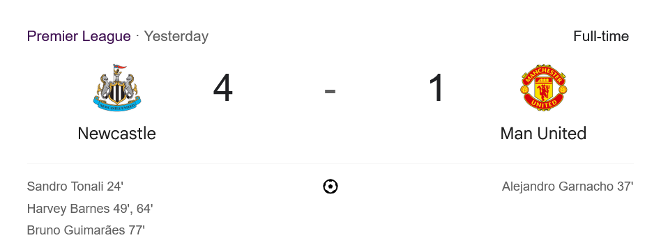 ชัยชนะของ นิวคาสเซิ่ล ยูไนเต็ด ทำให้พวกเขาแซงขึ้นรั้งอันดับ 4 ของตาราง มี 56 แต้มจาก 31 นัด นำหน้า แมนซิตี้ 1 แต้มแม้จะแข่งน้อยกว่า 1 นัด ถือเป็นการยึดพื้นที่ท็อปโฟร์ได้อย่างแข็งแกร่ง ด้าน แมนยู ตกไปอยู่อันดับ 14 มีเพียง 38 แต้ม โอกาสลุ้นโควตายุโรปแทบจะเลือนลาง แถมฟอร์มโดยรวมยังมีคำถามตามมาอีกมาก