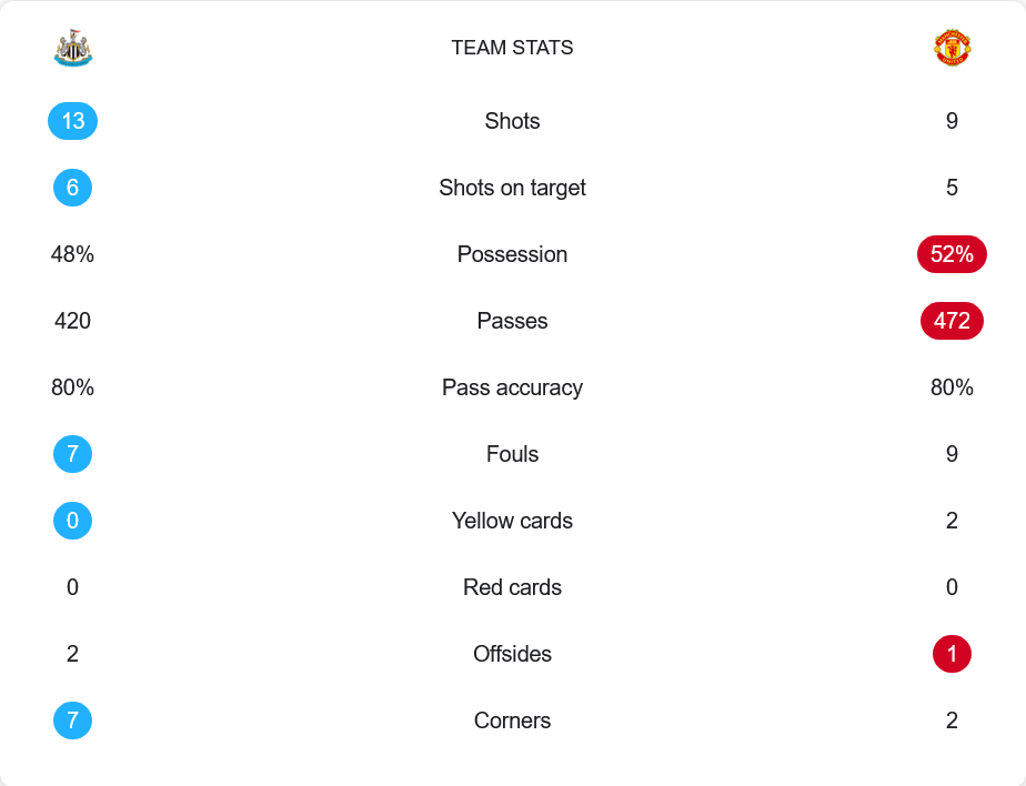 แม้ แมนยู จะครองบอลได้ 52% และผ่านบอลถึง 472 ครั้ง แต่ความแม่นยำอยู่ที่ 80% เท่ากับฝั่งเจ้าบ้าน นิวคาสเซิ่ล ที่ผ่านบอล 420 ครั้ง และครองบอล 48% เท่านั้น โดยสาลิกาดงยิงรวม 13 ครั้ง เข้ากรอบ 6 หน ขณะที่แมนยูยิงได้เพียง 9 ครั้ง เข้ากรอบ 5 หน ความแตกต่างสำคัญอยู่ที่คุณภาพในการจบสกอร์ซึ่งฝั่งเจ้าบ้านเฉียบคมและไม่ปล่อยให้โอกาสหลุดลอย โดยเฉพาะครึ่งหลังที่กดเพิ่มอีก 3 ลูก ขณะที่แมนยูมีแค่การ์นาโช่ที่ดูโดดเด่น