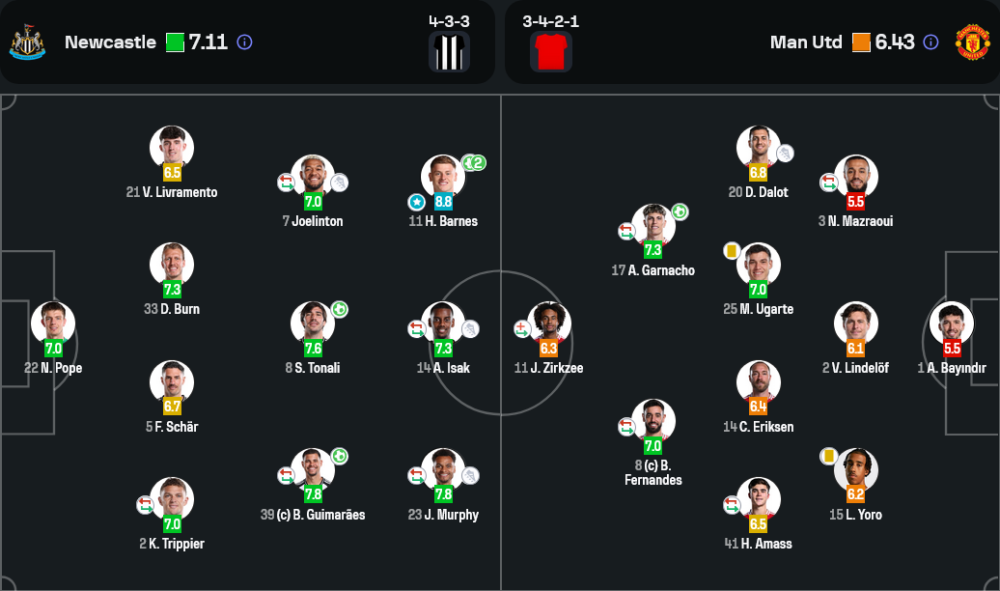 ฮาร์วีย์ บาร์นส์ คือชื่อที่ต้องยกย่องเป็นพิเศษในค่ำคืนนี้ ด้วยคะแนน 8.8 เขาโชว์ฟอร์มสุดจัดทั้งยิงสองประตู ตัดเกมรับของแมนยูพังไม่เป็นท่า ความเร็วและความแม่นยำในการเข้าทำคือสิ่งที่สร้างความแตกต่างในเกมนี้ได้อย่างชัดเจน