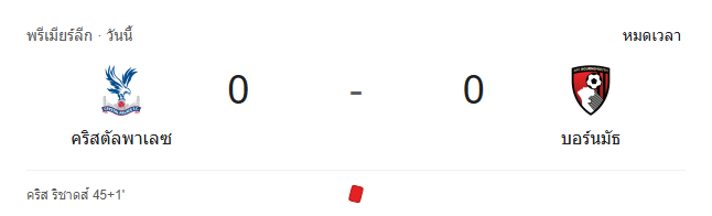 - จบครึ่งแรก: คริสตัล พาเลซ 0-0 บอร์นมัธ — เจ้าถิ่นต้องเล่นน้อยกว่าหนึ่งคน!