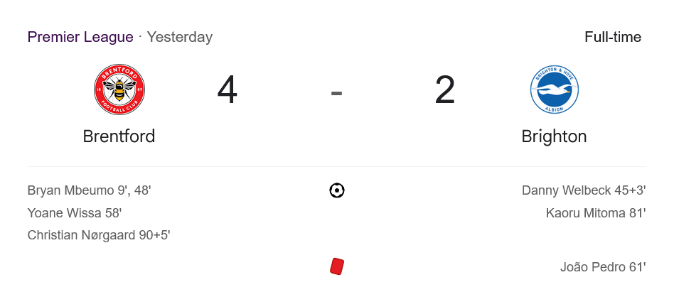 จาก : ผลบอลสด พรีเมียร์ลีก 2025 ระหว่าง เบรนท์ฟอร์ด 4-2 ไบรท์ตัน โฮฟ อัลเบี้ยน วันนี้ 19/4/68 – บ้านกีฬา