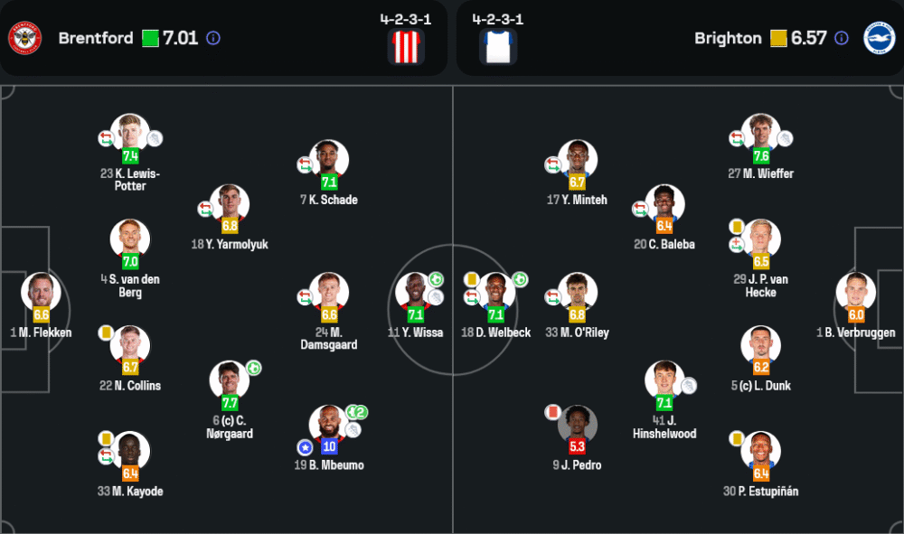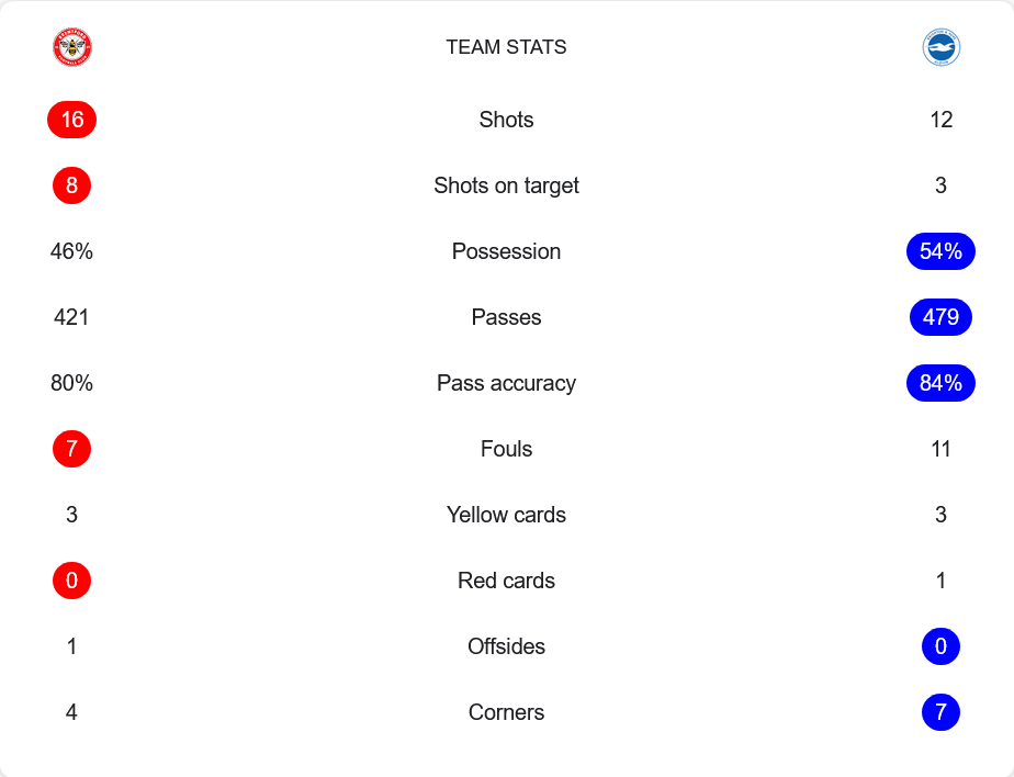 เกมนี้ เบรนท์ฟอร์ดมีโอกาสยิงถึง 16 ครั้ง เข้ากรอบ 8 ครั้ง แม้จะครองบอลแค่ 46% แต่ใช้โอกาสได้อย่างคมกริบ ผิดกับไบรท์ตันที่แม้จะครองบอลมากถึง 54% มีโอกาสยิง 12 ครั้ง เข้ากรอบเพียง 3 ครั้งเท่านั้น การผ่านบอลไบรท์ตันแม่นยำกว่าที่ 84% เทียบกับเบรนท์ฟอร์ดที่ 80% แต่ก็ไม่สามารถเปลี่ยนการครองเกมให้กลายเป็นประตูได้ และเมื่อทีมเยือนเสียใบแดง เกมก็ตกเป็นของเจ้าถิ่นอย่างสิ้นเชิง